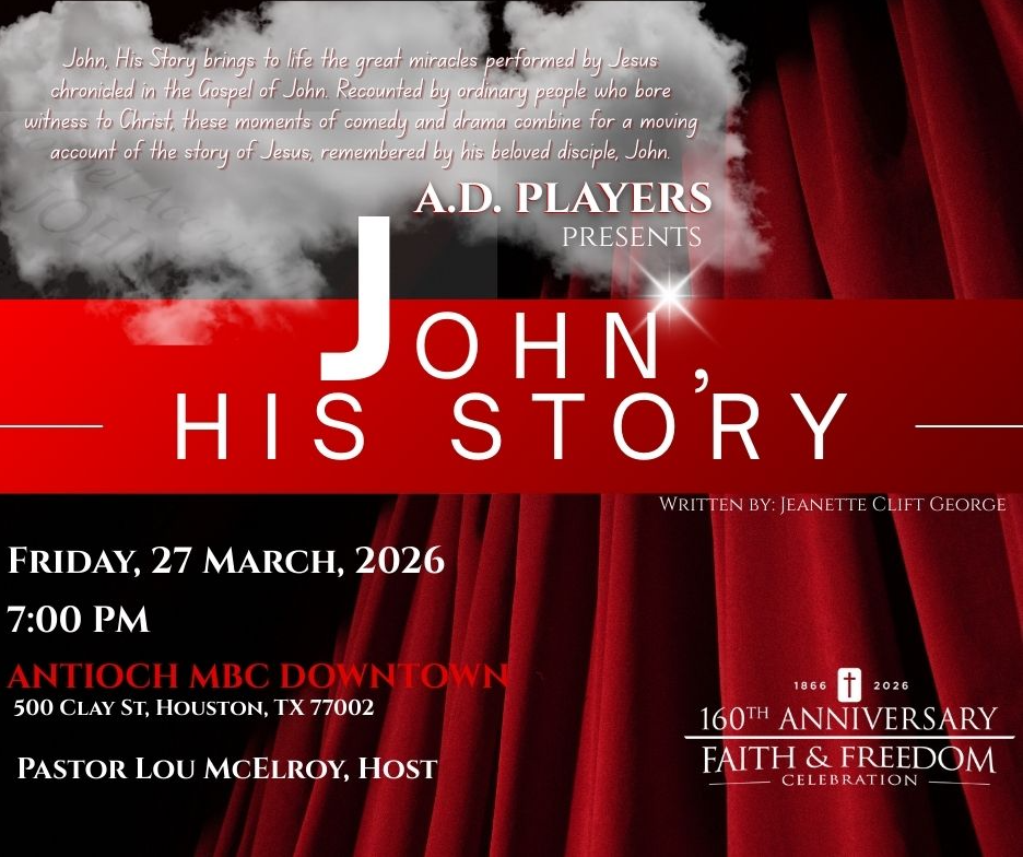As part of Antioch Baptist Church’s 160th Anniversary Celebration, the A.D. Players of the George Theater will perform in a FREE play entitled, “The Gospel of John” on Friday, March 27th @ 7:00 pm.